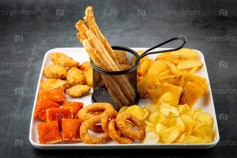 Пивной сет с наггетсами, луковыми кольцами в панировке, картофелем фри и соусами