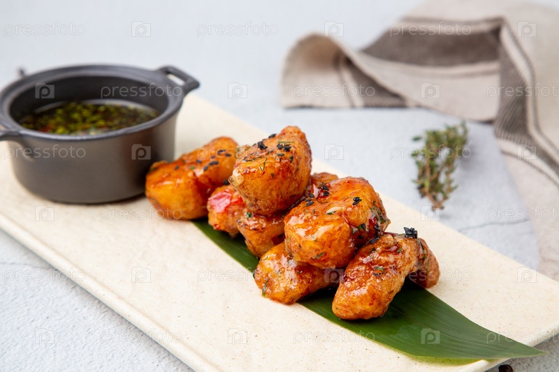 Кусочки судака в кисло-сладком соусе на банановом листе