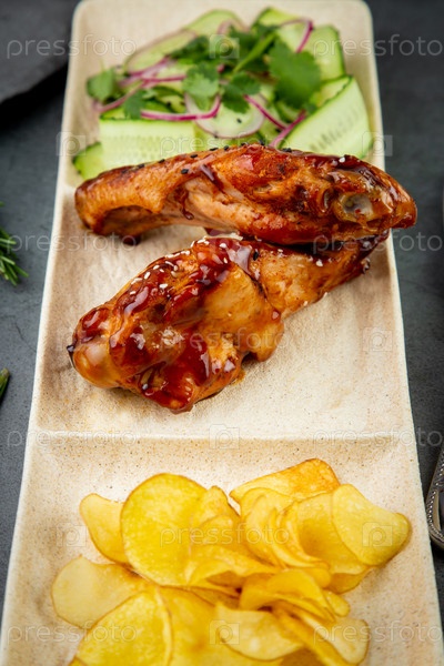 Европейское блюдо. Курица в соусе, с жареным картофелем и салатом из огурцов, зеленью и луком. темный фон