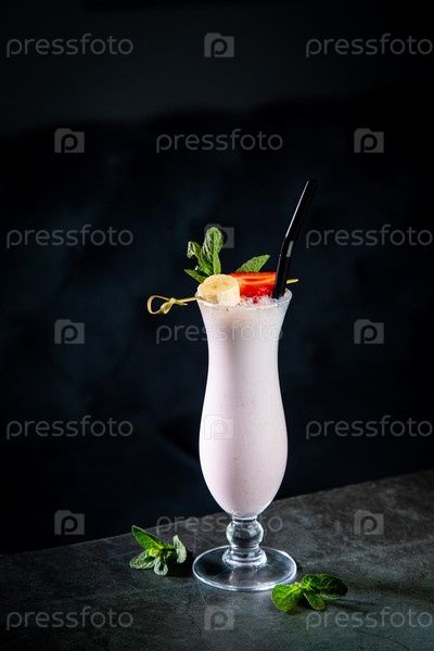 Молочный коктейль с клубникой, бананом, мятой и льдом, вид сбоку