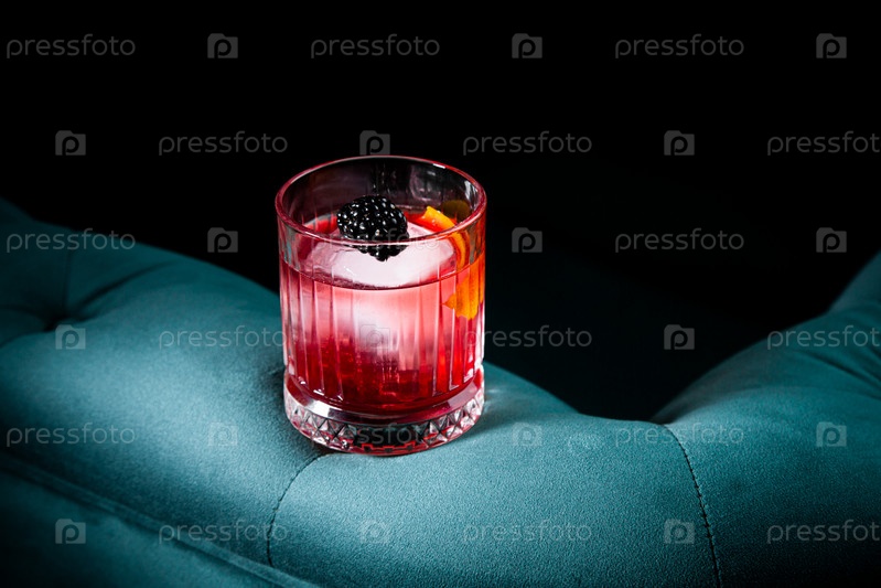 Красный коктейль с ягодным сиропом и круглым льдом с видом сбоку ежевики