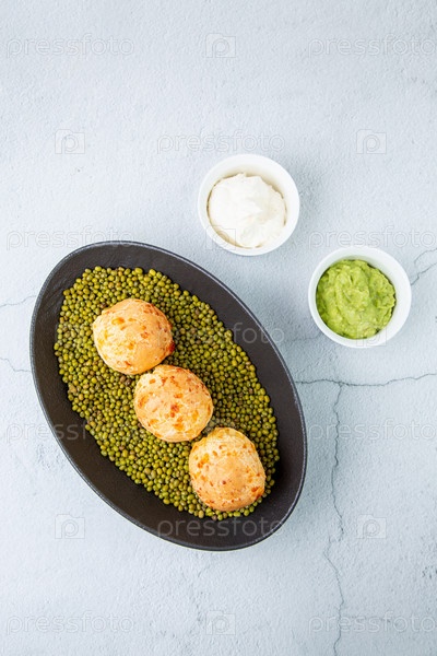 Приготовленные котлеты на горошине в продолговатой миске