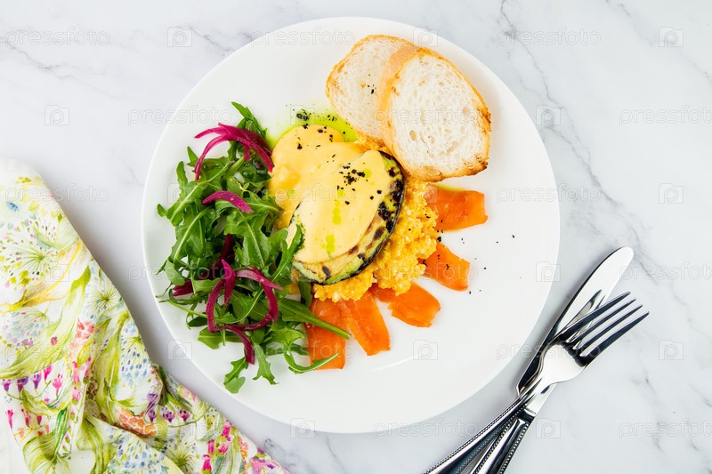 Смесь лосося, салата из рукколы, белого хлеба и запеченного авокадо с сыром. Светлый фон