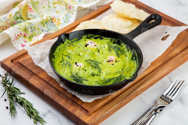 Яичница с зеленью, укропом, сельдереем и брокколи на сковороде с постными хрустящими хлебцами