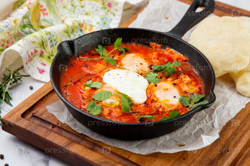 Шакшука — яичница с зеленью, фасолью и помидорами на сковороде с постными хрустящими хлебцами
