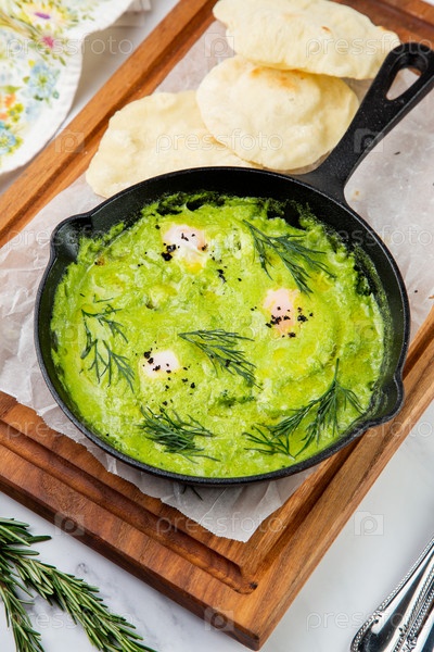 Яичница с зеленью, укропом, сельдереем и брокколи на сковороде с постными хрустящими хлебцами