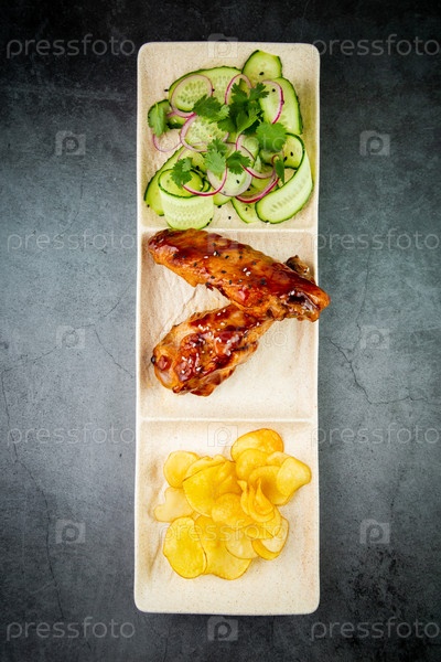 Европейское блюдо. Курица в соусе, с жареным картофелем и салатом из огурцов, зеленью и луком. темный фон