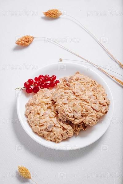 Цельнозерновое печенье с веточкой красной смородины в маленькой белой тарелке, вид сбоку