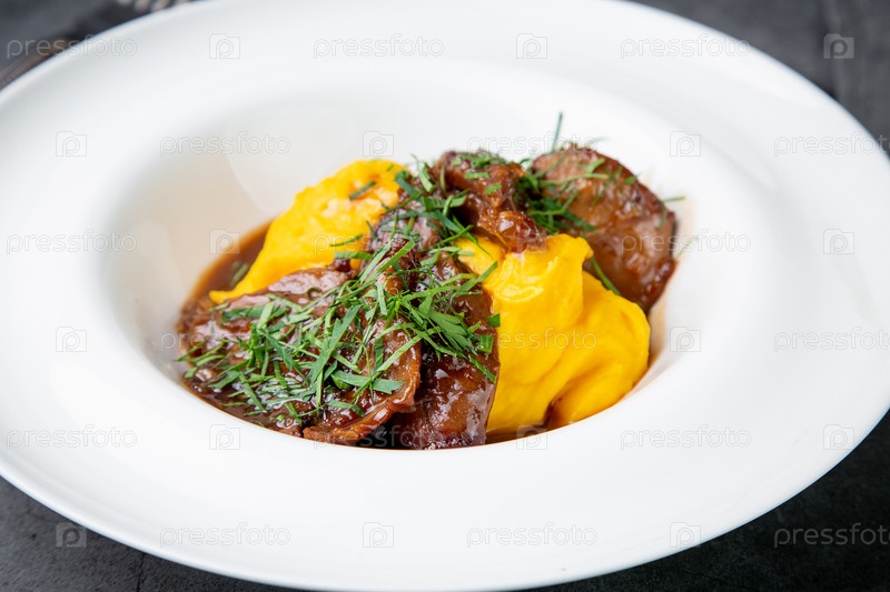 Картофельное пюре с мясом, соусом и зеленью в глубокой тарелке, вид сбоку