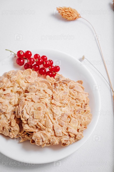 Цельнозерновое печенье с веточкой красной смородины в маленькой белой тарелке, вид сбоку