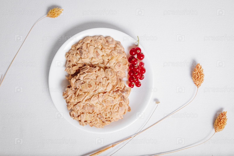 Цельнозерновое печенье с веточкой красной смородины в маленькой белой тарелке, вид сверху