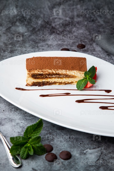 Бисквит с клубникой, мятой и шоколадным сиропом на белой тарелке, вид сбоку