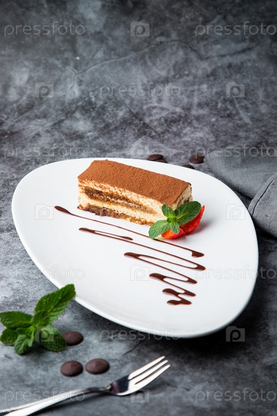 Бисквит с клубникой, мятой и шоколадным сиропом на белой тарелке, вид сбоку