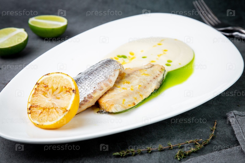 Кусочки жареной рыбы с соусом и жареным лимоном на белой тарелке, вид сбоку