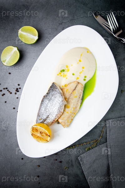 Кусочки жареной рыбы с соусом и жареным лимоном на белой тарелке, вид сверху