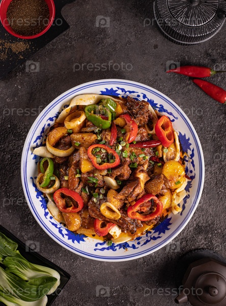 Лапша с болгарским перцем, картофелем, мясом и зеленью в тарелке с узором сверху