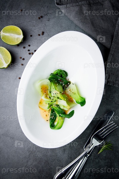 Блюдо из яиц и морских водорослей с кунжутом и лаймом на заднем плане, красивый вид сверху на тарелку