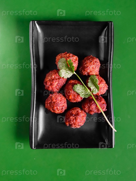 Фрикадельки из говядины и свинины с петрушкой на черной тарелке, на зеленом фоне. Вид сверху. китайская кухня