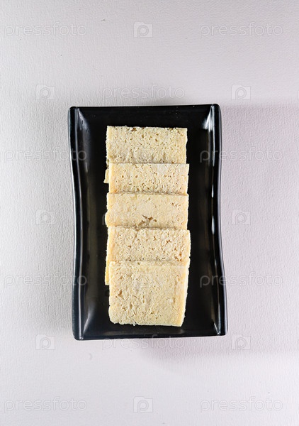 Мягкий и свежий белый хлеб на черной тарелке. Китайская кухня, ингредиент тушеного мяса