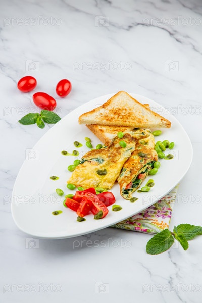 Завтрак из яиц и овощей с помидорами черри и ломтиками хлеба на белой тарелке, вид сбоку
