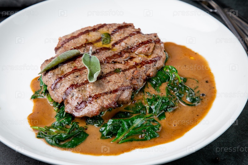 Стейк из говядины с соусом и зеленью на белой тарелке