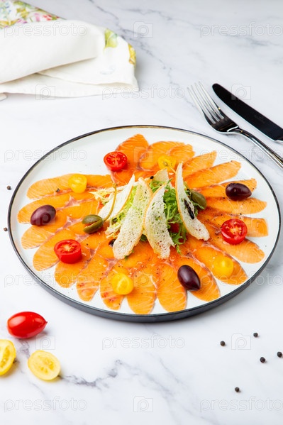 Тонко нарезанные кусочки копченого лосося с помидорами черри, оливками и зеленью на белой тарелке. вид сверху