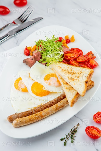 Яичница с овощами, помидорами черри, хлебом, зеленью и сосисками на белой тарелке, вид сбоку