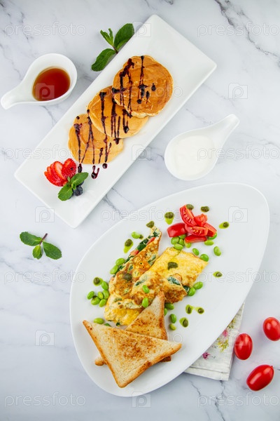 Завтрак из яиц и овощей с помидорами черри и ломтиками хлеба в белой тарелке с видом на блины