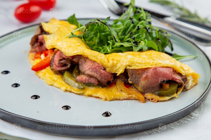 Завтрак из яиц с мясом, зеленью и каплями соуса на круглой тарелке, вид сбоку