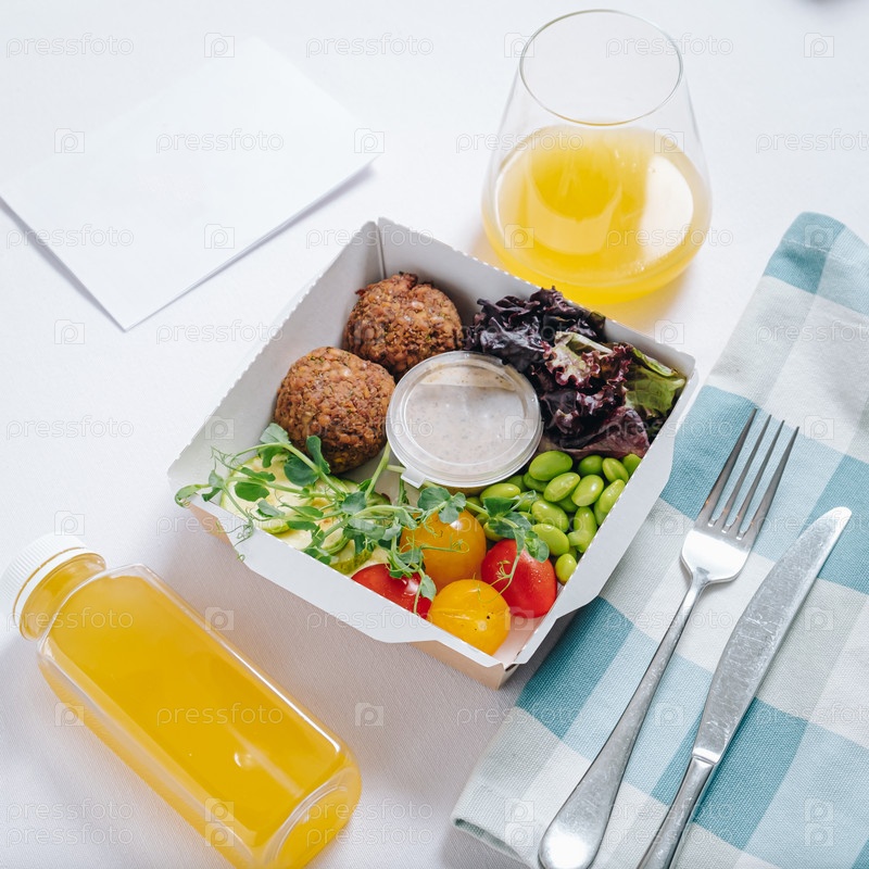 Миска в китайском стиле. фрикадельки с фасолью, зеленью, помидорами черри и соусом в контейнере
