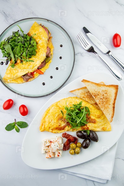 Завтрак из яиц с мясом, зеленью и каплями соуса с хлебом на круглой тарелке, вид сверху