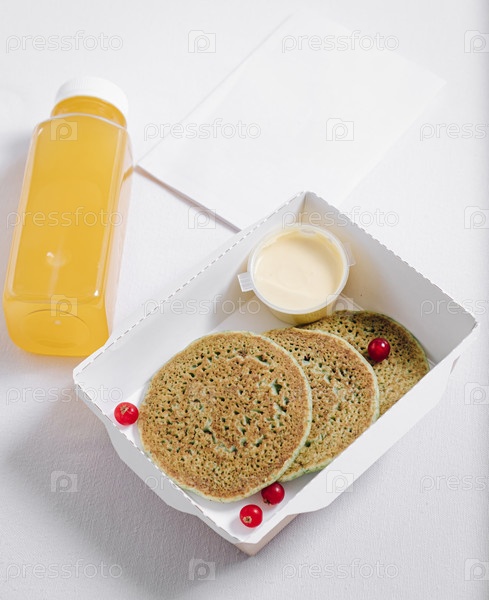 Блины с ягодами и сливками в белой таре