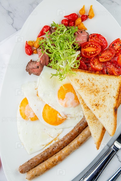 Яичница с овощами, помидорами черри, хлебом, зеленью и сосисками на белой тарелке, вид сбоку