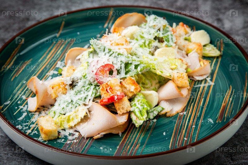 Вид сбоку салата Цезарь с сыром на синей тарелке