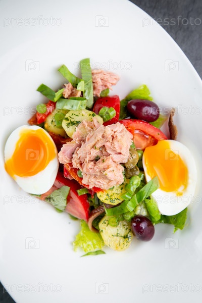 Салат с яйцом всмятку, тунцом, зеленым луком, отварным картофелем, вид сверху