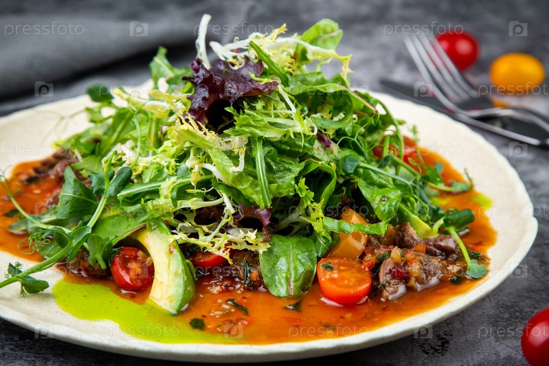 Салат из рукколы, листьев салата, помидоров черри и авокадо, вид сбоку