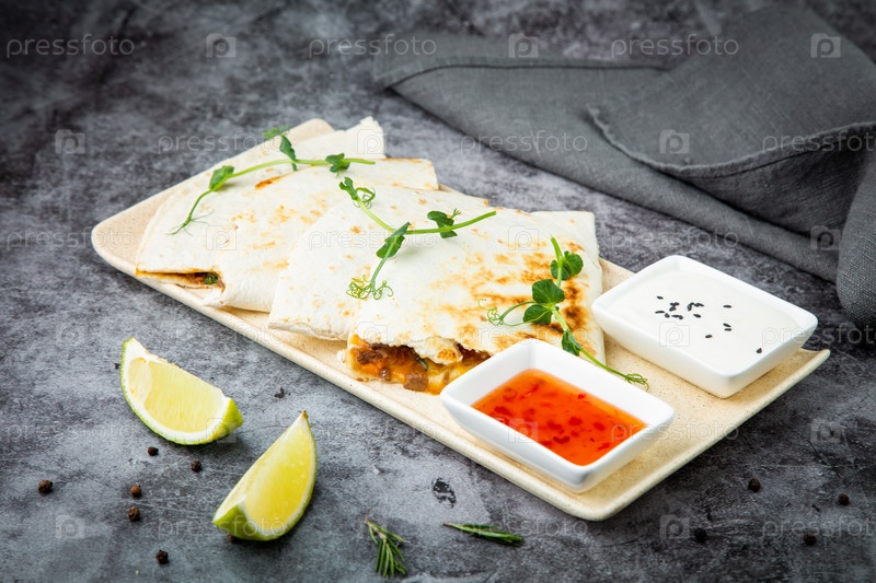 Хрустящие лепешки с начинкой из мяса, зелени, лайма и двух соусов, вид сбоку