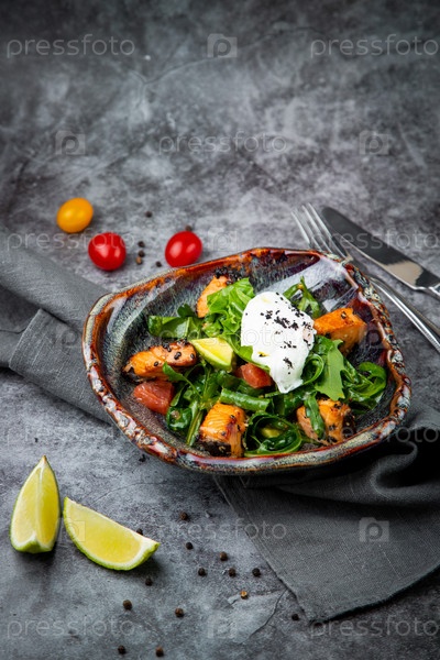 Салат с красной рыбой, зеленью и лаймом, вид сбоку