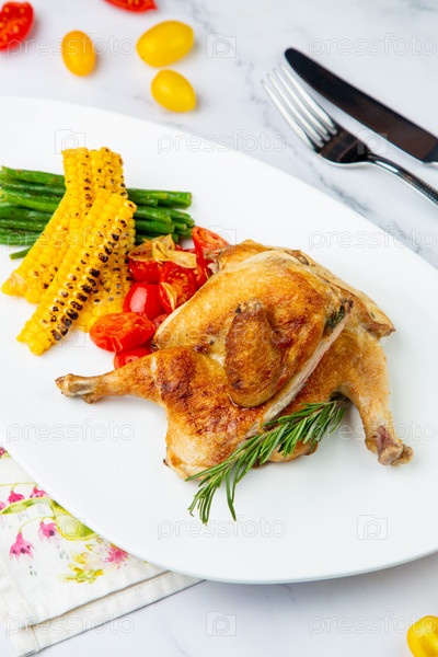 Курица-гриль с помидорами и кукурузой, вид сбоку