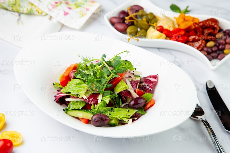 Салат из зелени, листьев салата, огурцов, розового лука, вид сбоку