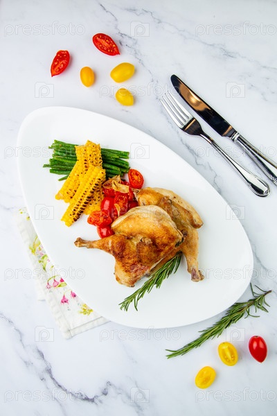 Курица-гриль с помидорами и кукурузой, вид сверху