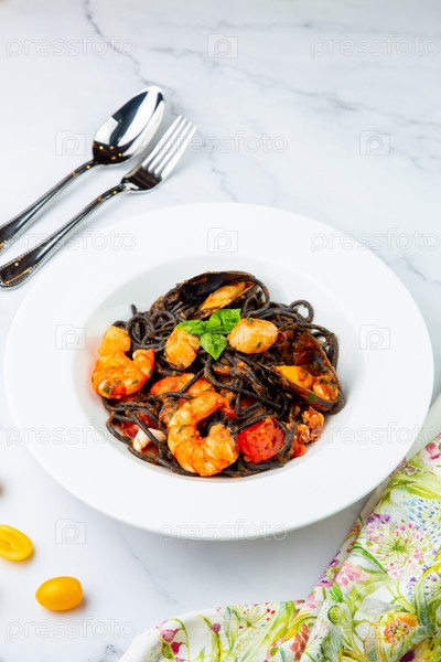 Черная лапша с мидиями, креветками, помидорами и зеленью, вид сбоку