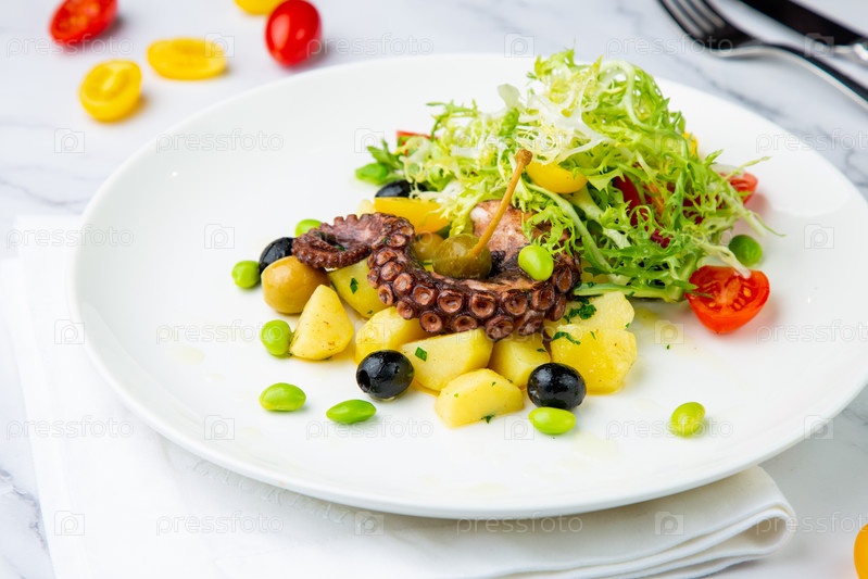 Салат с оливками, зеленью, помидорами черри, картофелем и щупальцами осьминога, вид сбоку