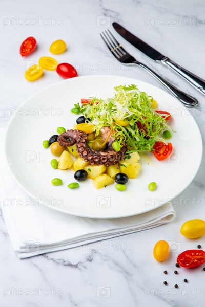 Салат с оливками, зеленью, помидорами черри, картофелем и щупальцами осьминога, вид сбоку