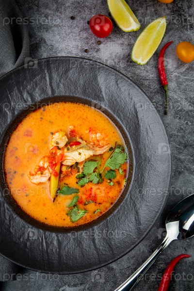 Суп том ям с курицей, лаймом, помидорами черри и петрушкой, вид сверху