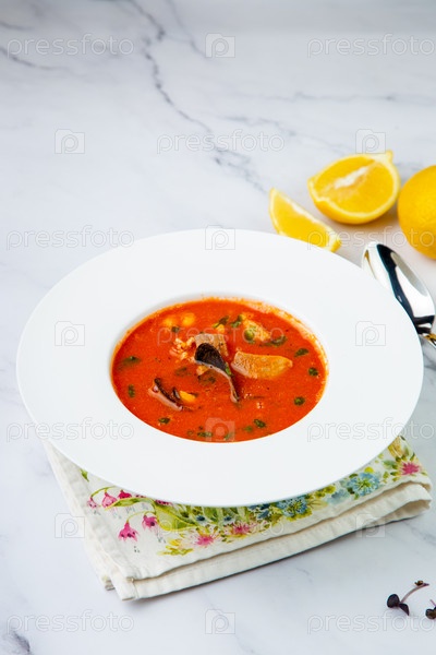 Вид сбоку тыквенного крем-супа с кусочками мяса в белой тарелке