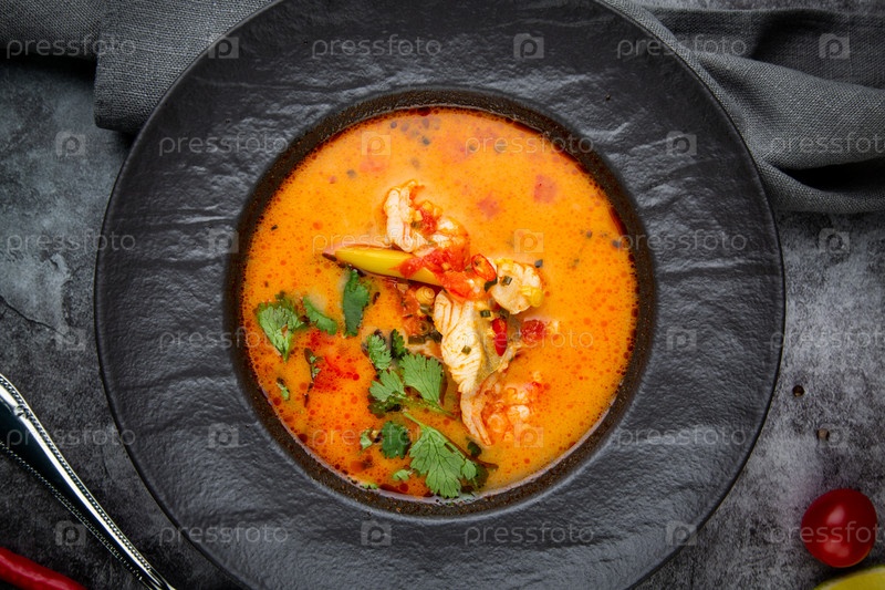 Суп том ям с курицей, лаймом, помидорами черри и петрушкой, вид сверху
