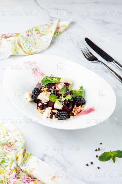 Салат из ежевики, свеклы, семян и сыра, вид сбоку на белой тарелке