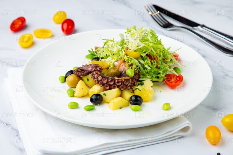 Салат с оливками, зеленью, помидорами черри, картофелем и щупальцами осьминога, вид сбоку