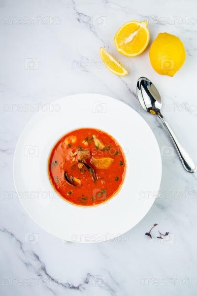 Вид сверху на тыквенный крем-суп с кусочками мяса в белой тарелке